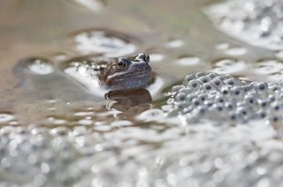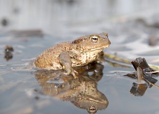 A majestic toad, reflected on the surface of a pond. Photo by James Lees/WWT