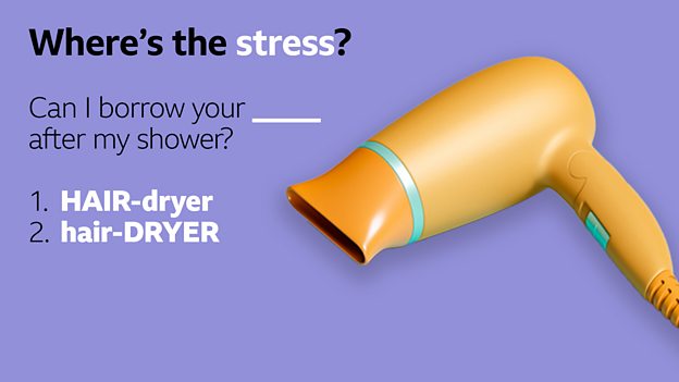 WHERE'S THE STRESS?: The word ‘hairdryer’ is a compound noun, meaning that it is a word made up of two existing words – hair and dryer - but do you know where the stress goes? 🤔 Scroll down to see the answer.⁣