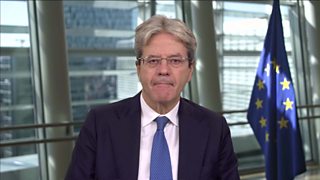 Zeinab Badawi speaks to the European commissioner for the economy Paolo Gentiloni.