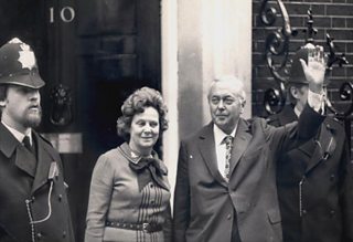 - The picture, from the BBC's picture library, shows Harold Wilson leaving Downing Street with wife Mary during another dramatic period in Westminster, in 1974.
